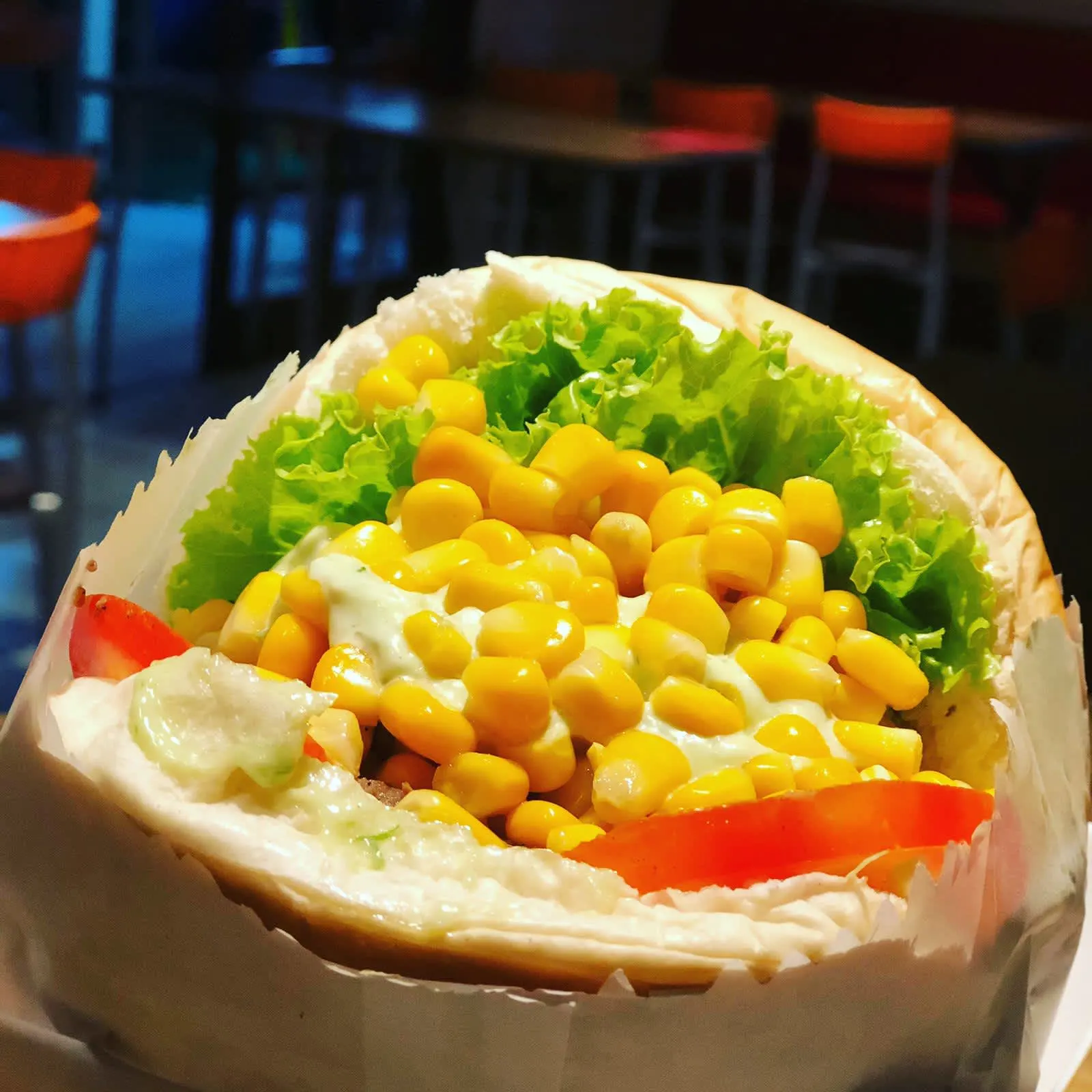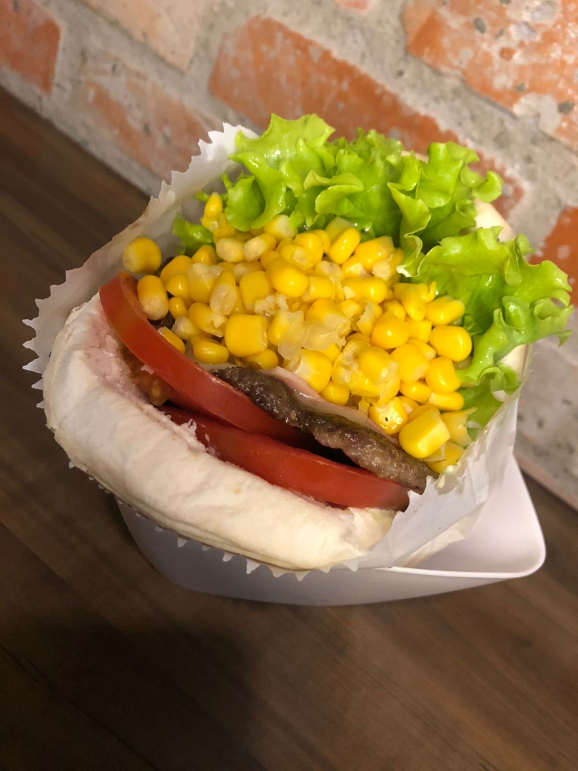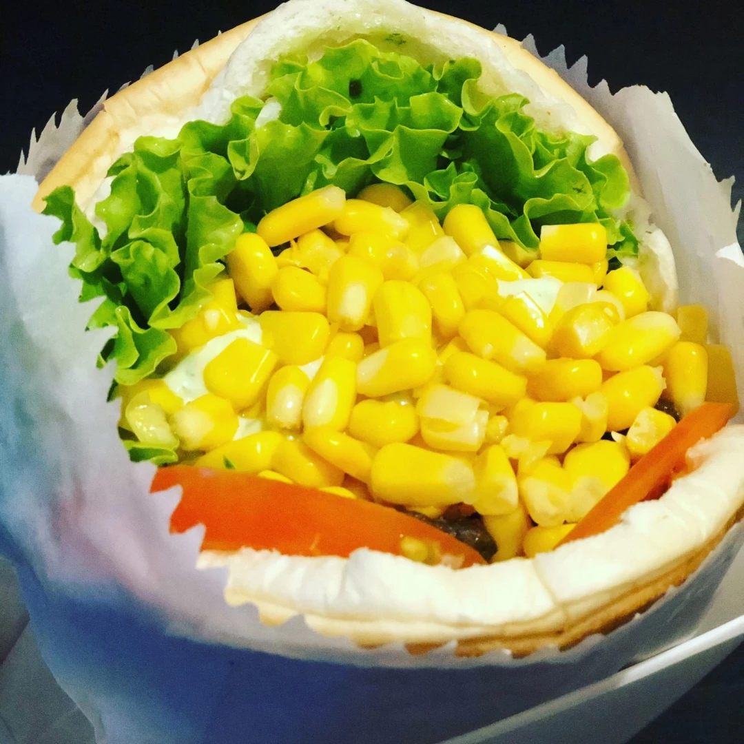Pão, hambúrguer, queijo, presunto, tomate, alface, ervilha, milho e maionese.