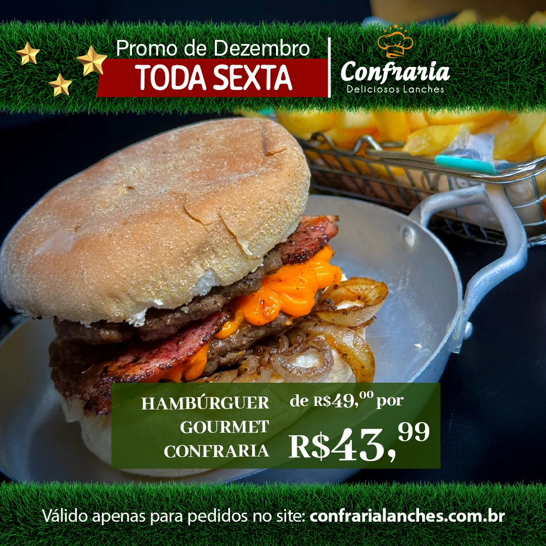 Pão, maionese, 2 hambúrgueres, queijo cheddar, cebola refogada, tiras de bacon. Acompanha batatas fritas aromatizadas com alecrim.